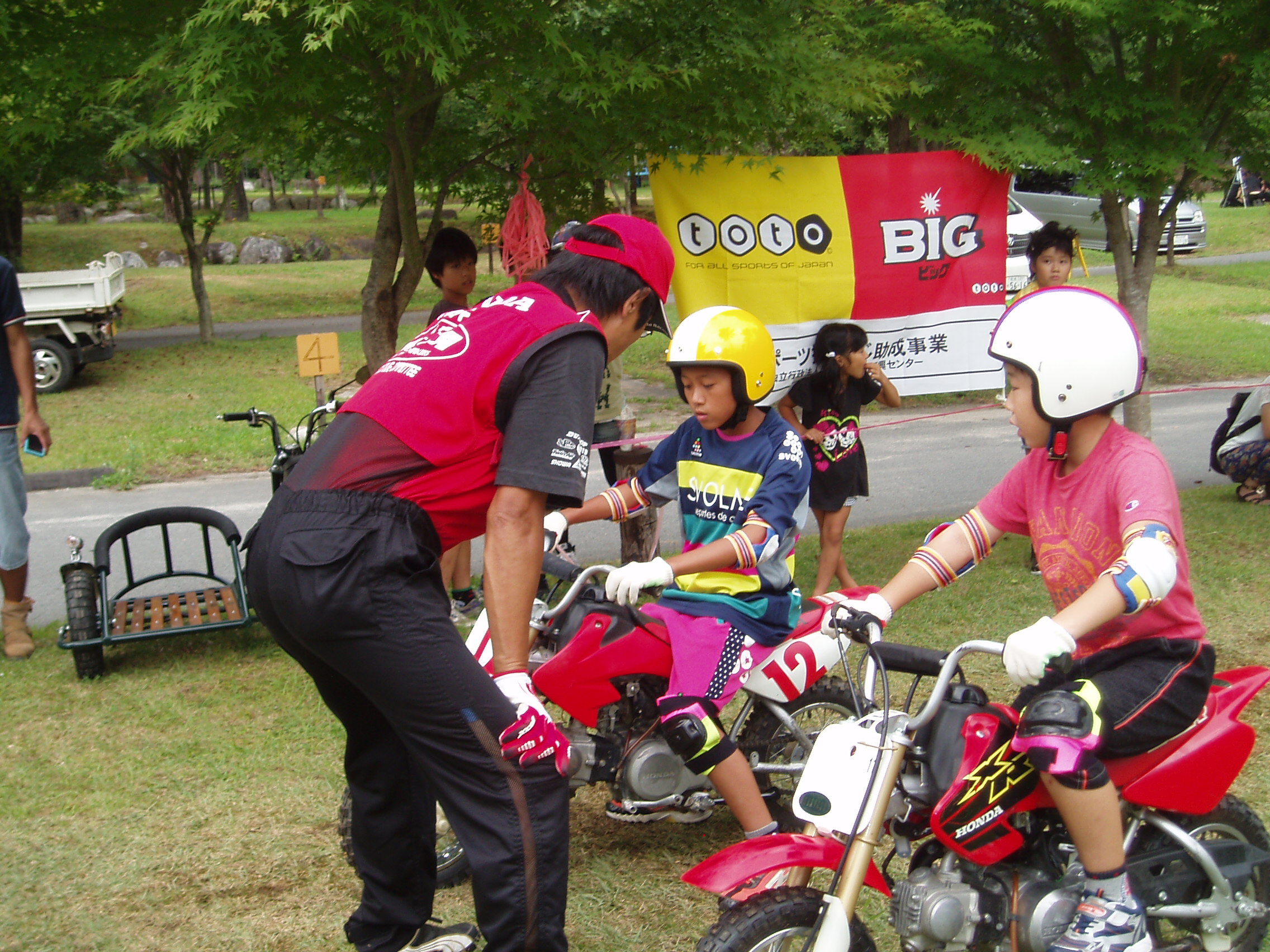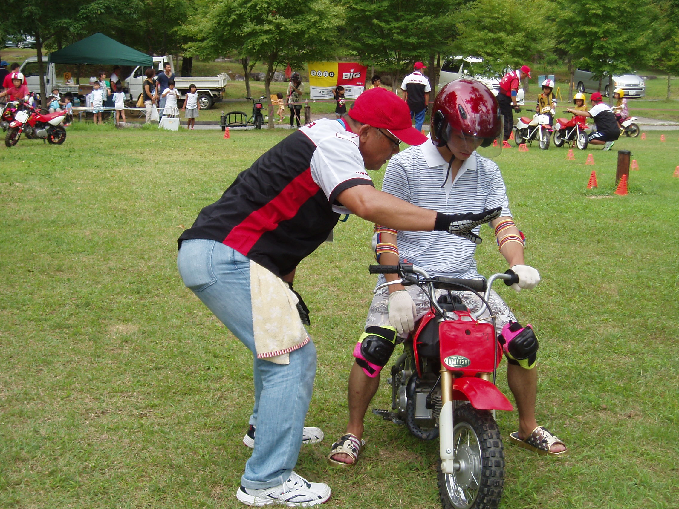 24日 飯島町与田切公園でちびっこオフロード体験教室を開催 芝生の上での環境の良い中、おおぜいのチビッコが参加してくれた。
